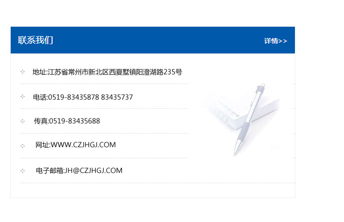 地址:常州市新北區友邦商務大廈1幢16、17層  電話:0519-85101652  傳真:0519-85112595  郵編:213022  網址:www.cz-jiayue_cn.yzymqq.com  郵箱:xiajifengaa@163.com